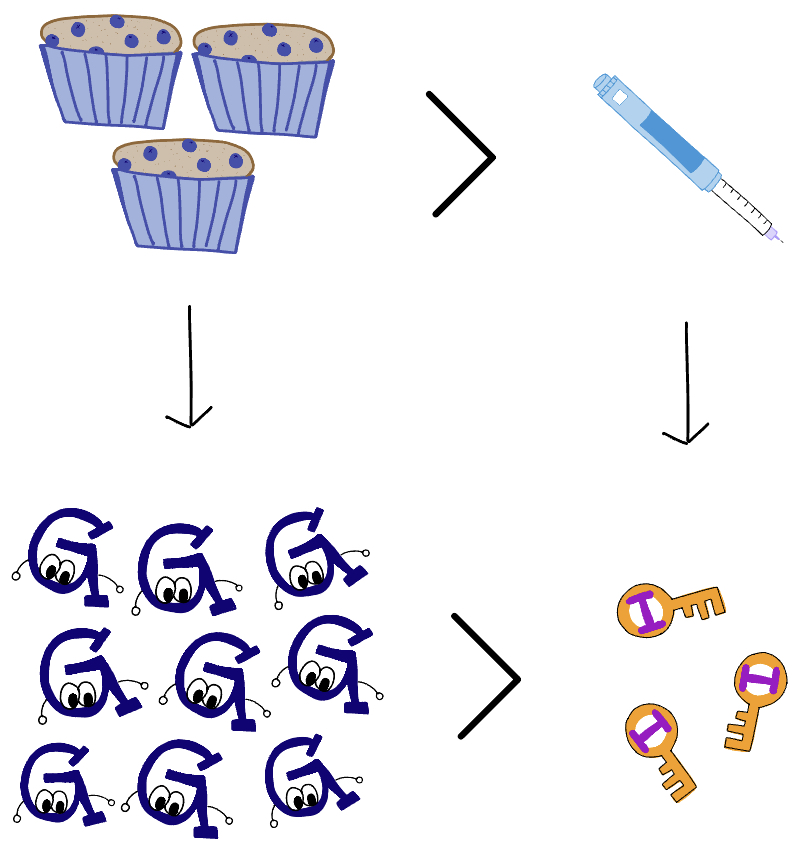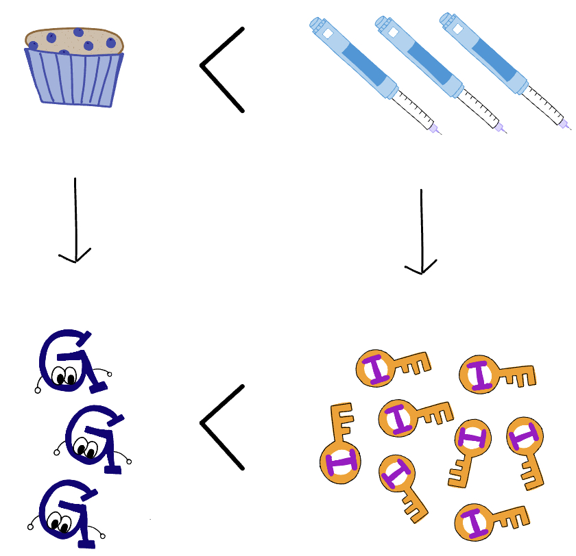 Hyperglycemia (High Blood Sugar): This is when there’s too much glucose in your blood. This can happen when there is not enough insulin in your bloodstream to allow the glucose to enter your cells. For example, if you eat a high carb meal and forget to bolus, your blood sugar will climb since the glucose in your blood has nowhere to go.