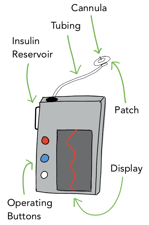 Insulin pumps are small devices that deliver insulin continuously throughout the day. They are made up of a pump that holds insulin and a thin tube called a cannula that is placed under the skin using a small needle. The pump is usually worn on a belt or kept in a pocket, and the cannula is attached to your body with a sticky patch.