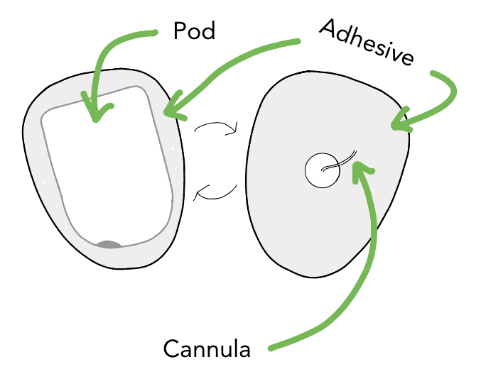 If you use a tubeless pump, it will sit stick directly to your body with an adhesive patch. The portion of the pump that sticks to your body is called a pod. The cannula sits directly under the pod, and the insulin reservoir is also contained within this pod. Both types of pumps can also connect to smart devices such as your phone! Since the tubeless system does not have a display, you can view information about insulin delivery on the connected smart device.